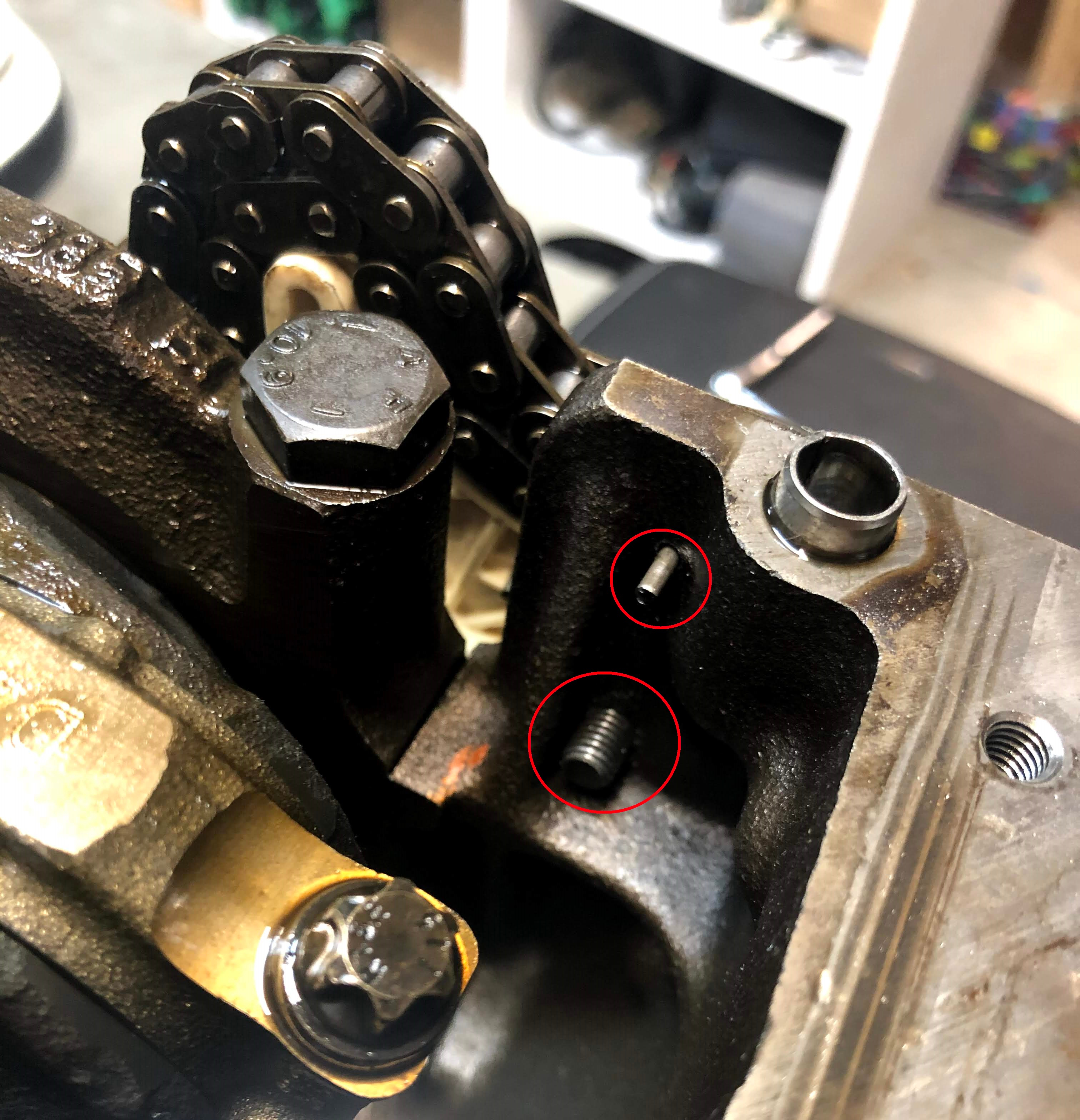 I’m jumping ahead a bit, but in these two pictures you can see me holding back the installed tensioner (left) and then letting the tensioner place force on the chain (right). It’s pretty clear that there’s a good bit of slack in the chain and I can only imagine what the chain is doing in normal running conditions.