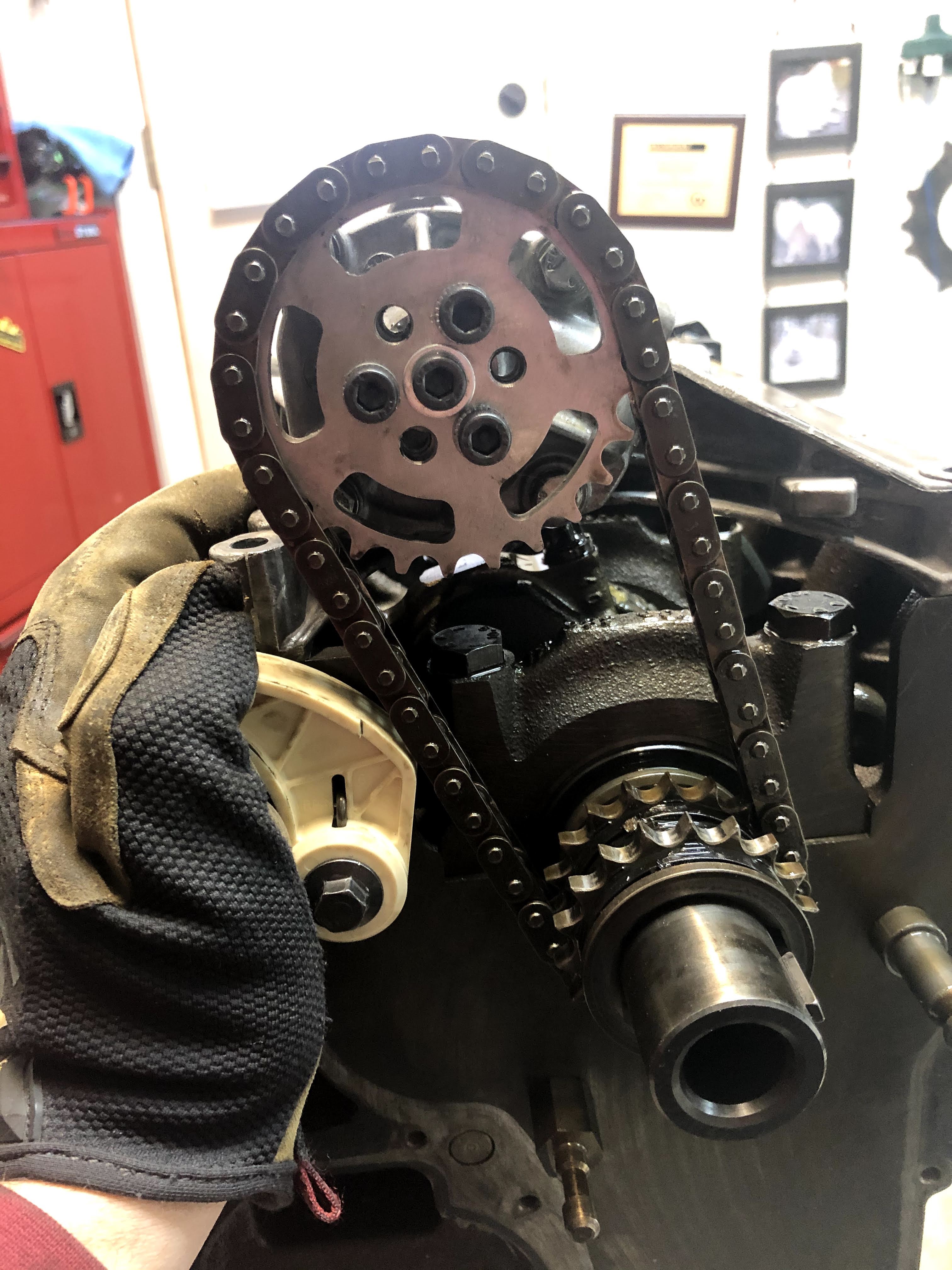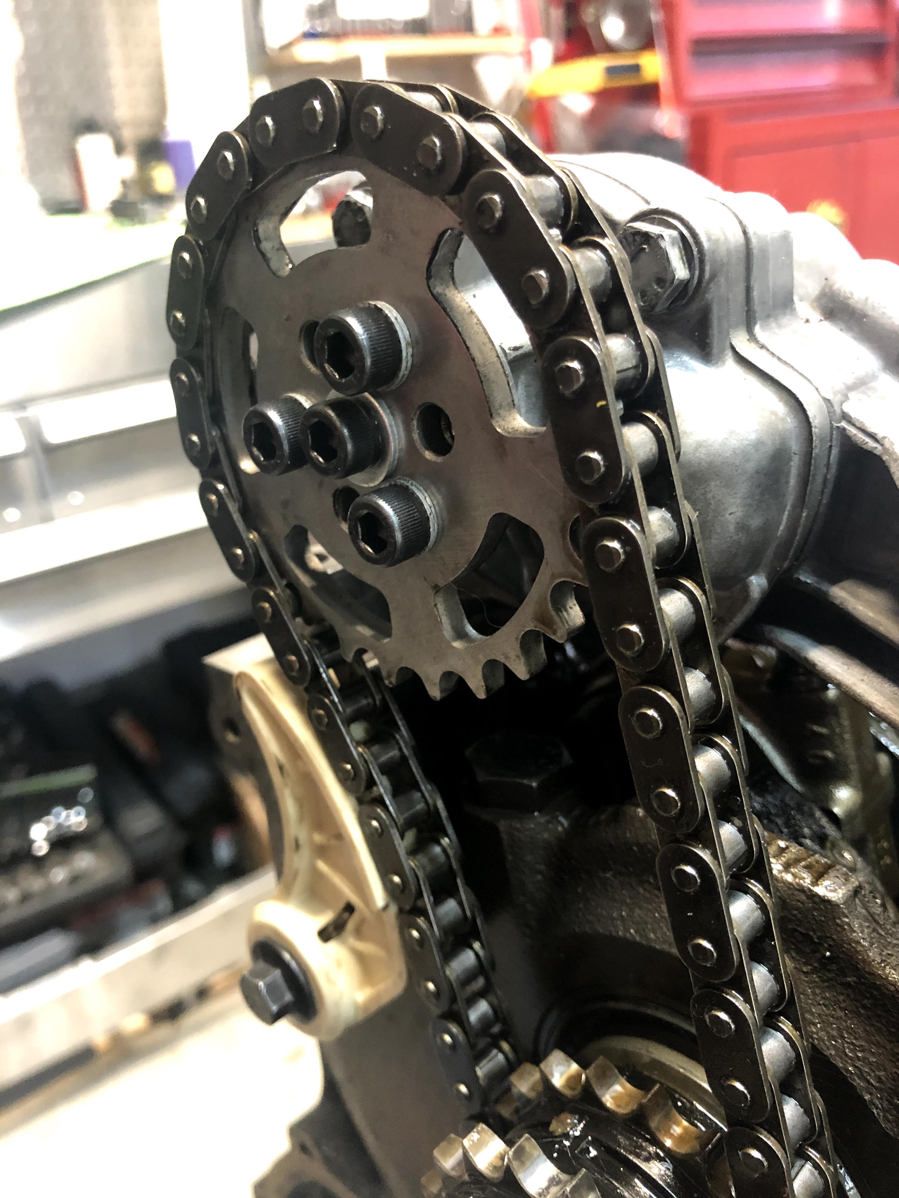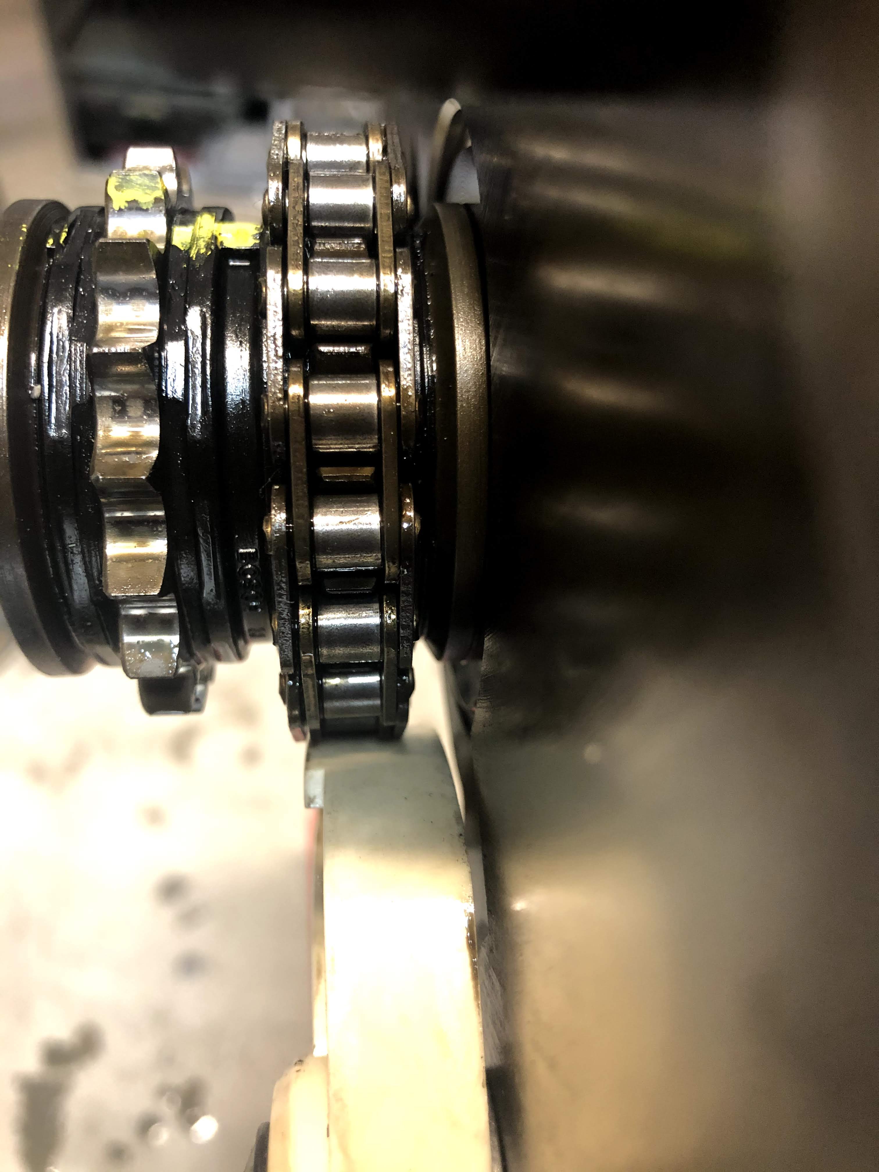 The next step was to make sure the oil pump chain was centered on the tensioner. In the picture above you can see how the chain is too far to the left of the tensioner.