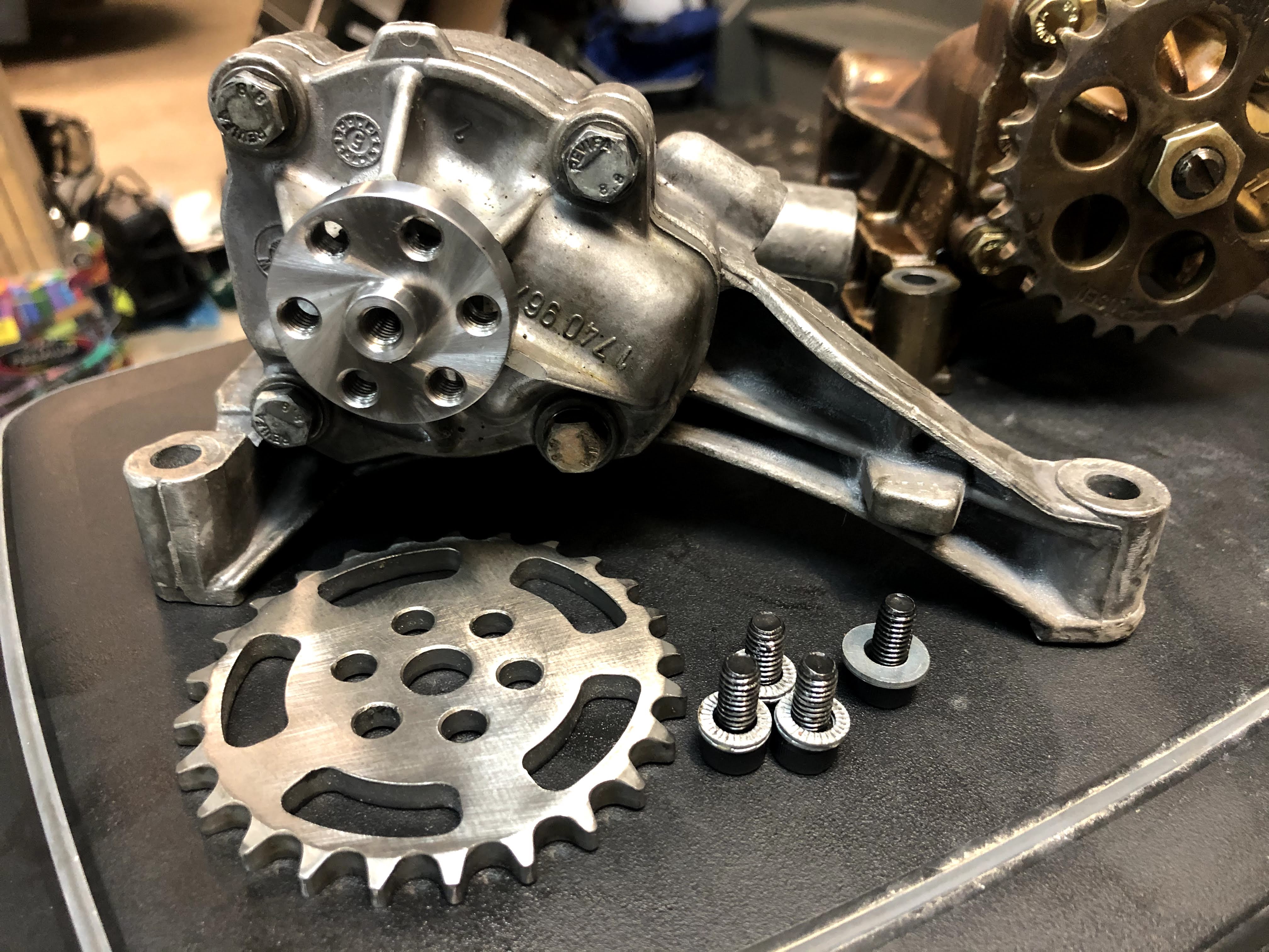 In the picture above, you can see the individual fasteners and sprocket unattached to the shaft in the oil pump. PRD also fully rebuilds the oil pumps with all new seals and checks/corrects internal pump tolerances.