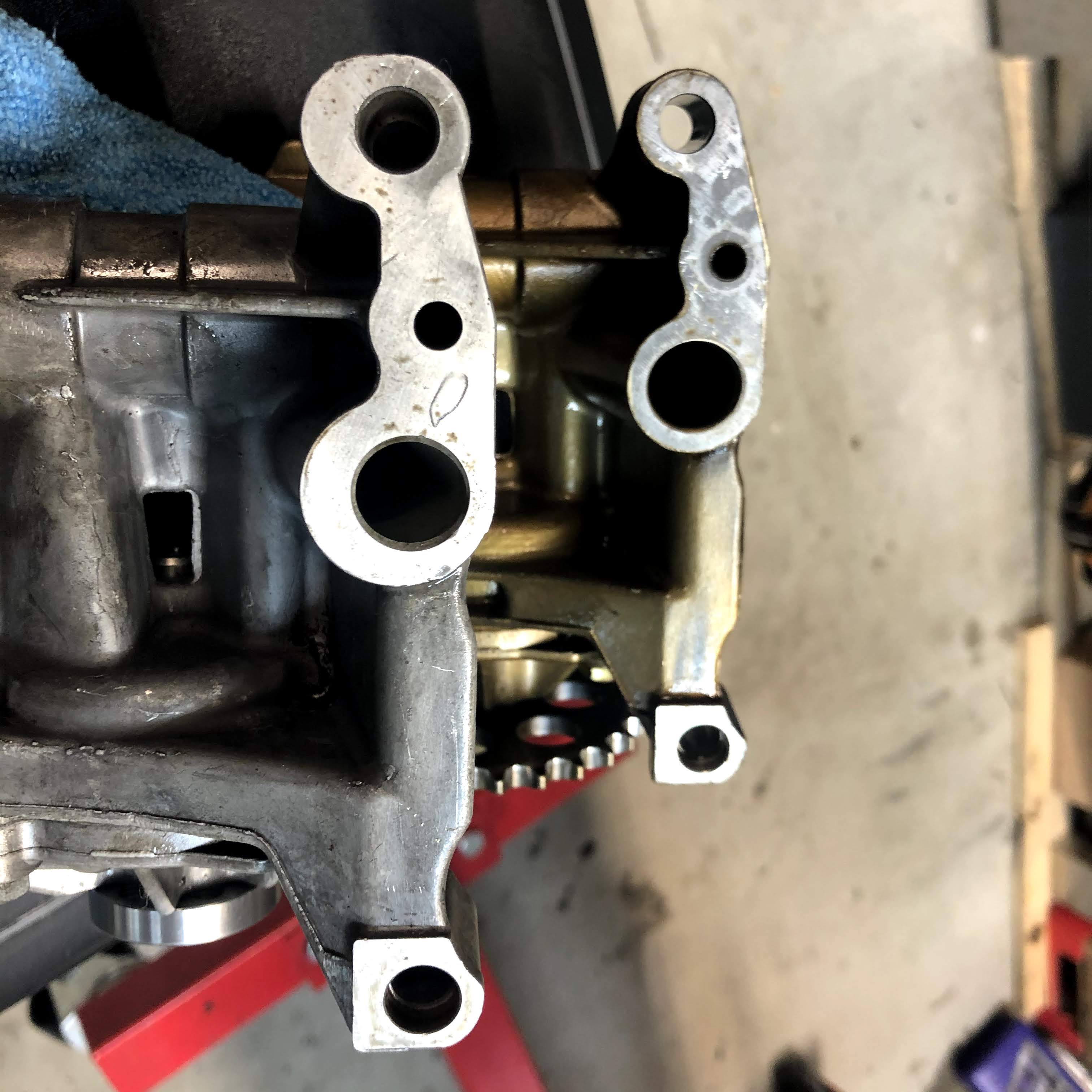 Here’s a side-by-side comparison showing the stock oil pump (left) next to the PRD oil pump (right). In this view it’s easy to see how PRD milled the front of the oil pump housing down in order to fit in the new hardened shaft with flange.