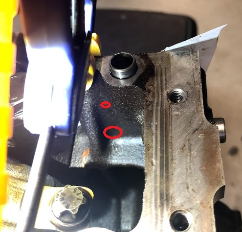 In order to mount the tensioner you actually have to drill two holes in the block (the two red circles) and then tap the larger one. PRD includes a template in their kit but I found that it didn’t actually match the pattern on my block. After moving the template around a little bit, the picture above shows my final placement.