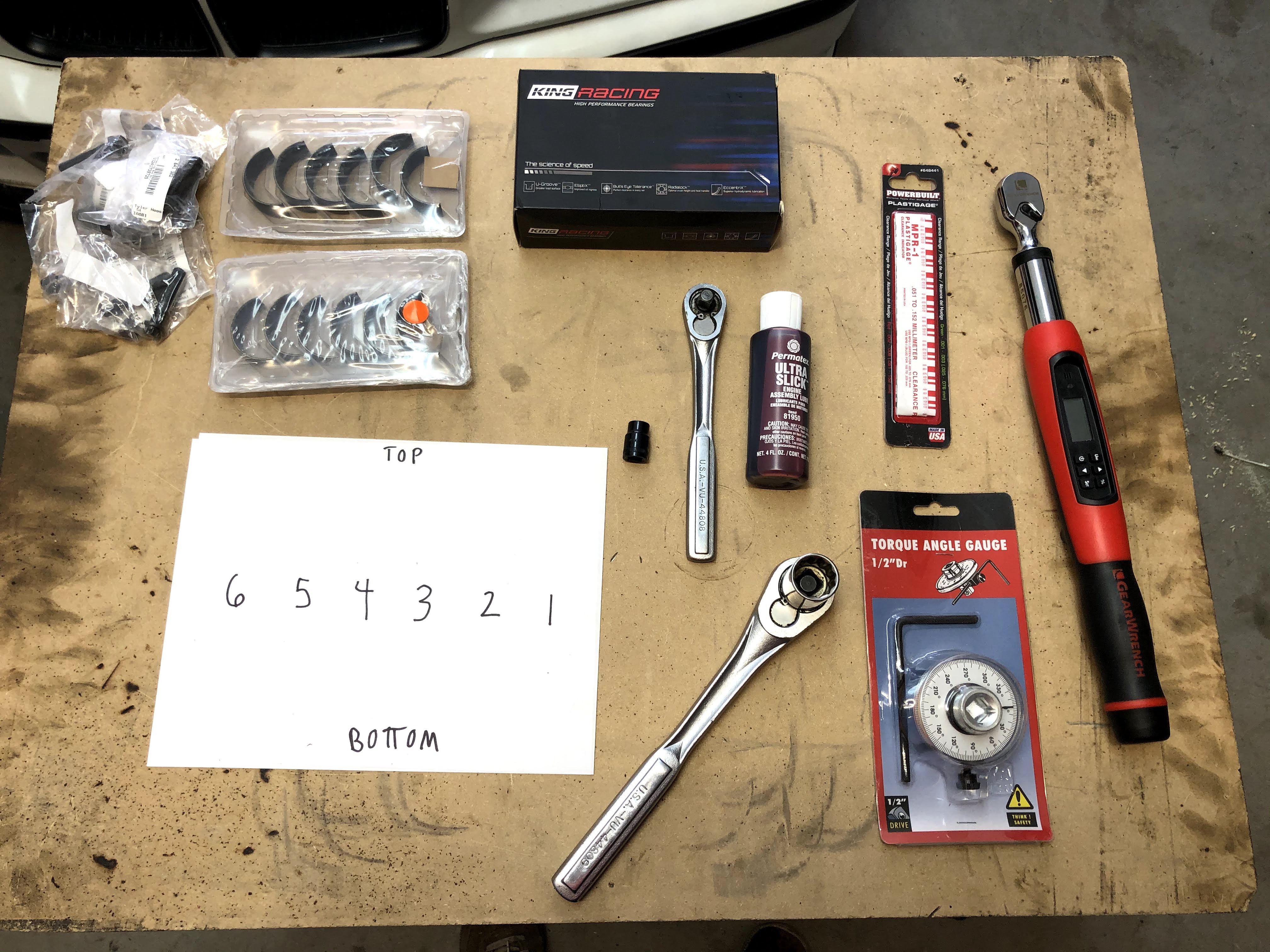 Once I was ready to install the new rod bearings, I made sure that I had all the parts and tools needed in order to complete the job effectively: