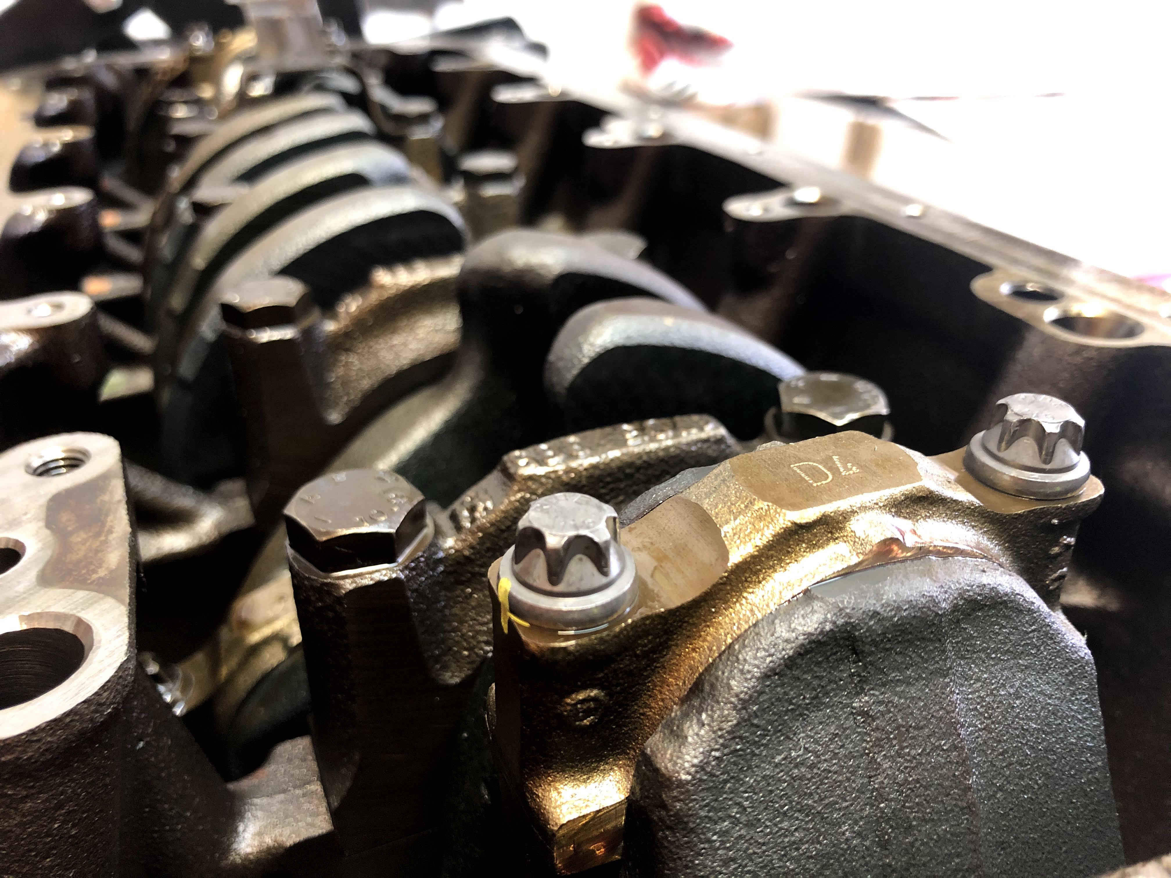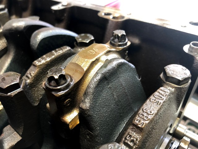 Time to take off the first cylinder’s connecting rod bearing cap. You can see that an E-Torx socket is required to remove the bolts.