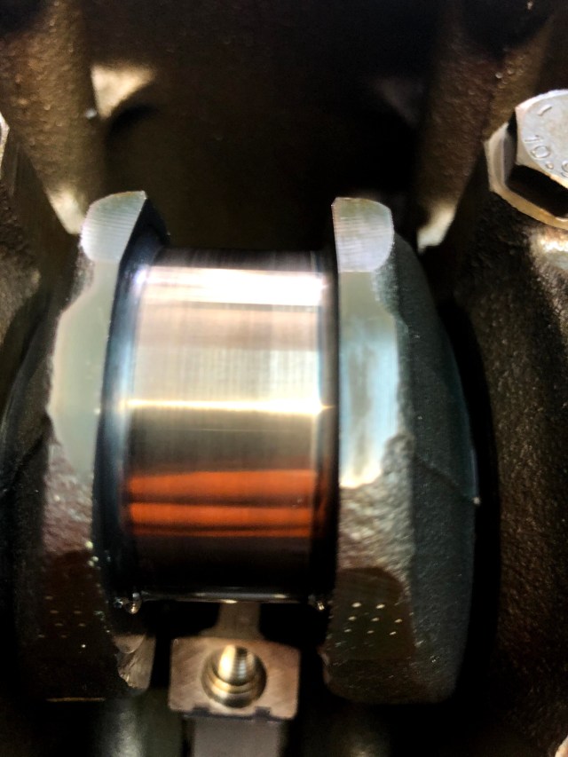 With the bolts removed, the cap should come off relatively easily. You can then check out the state of the crankshaft surface. Mine looked really good on each journal surface. At this point, resist the desire to remove the connecting rod bearing from the cap. You actually want to check bearing clearances of your stock setup. That’s where the Plastigage comes into play.