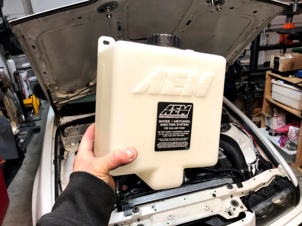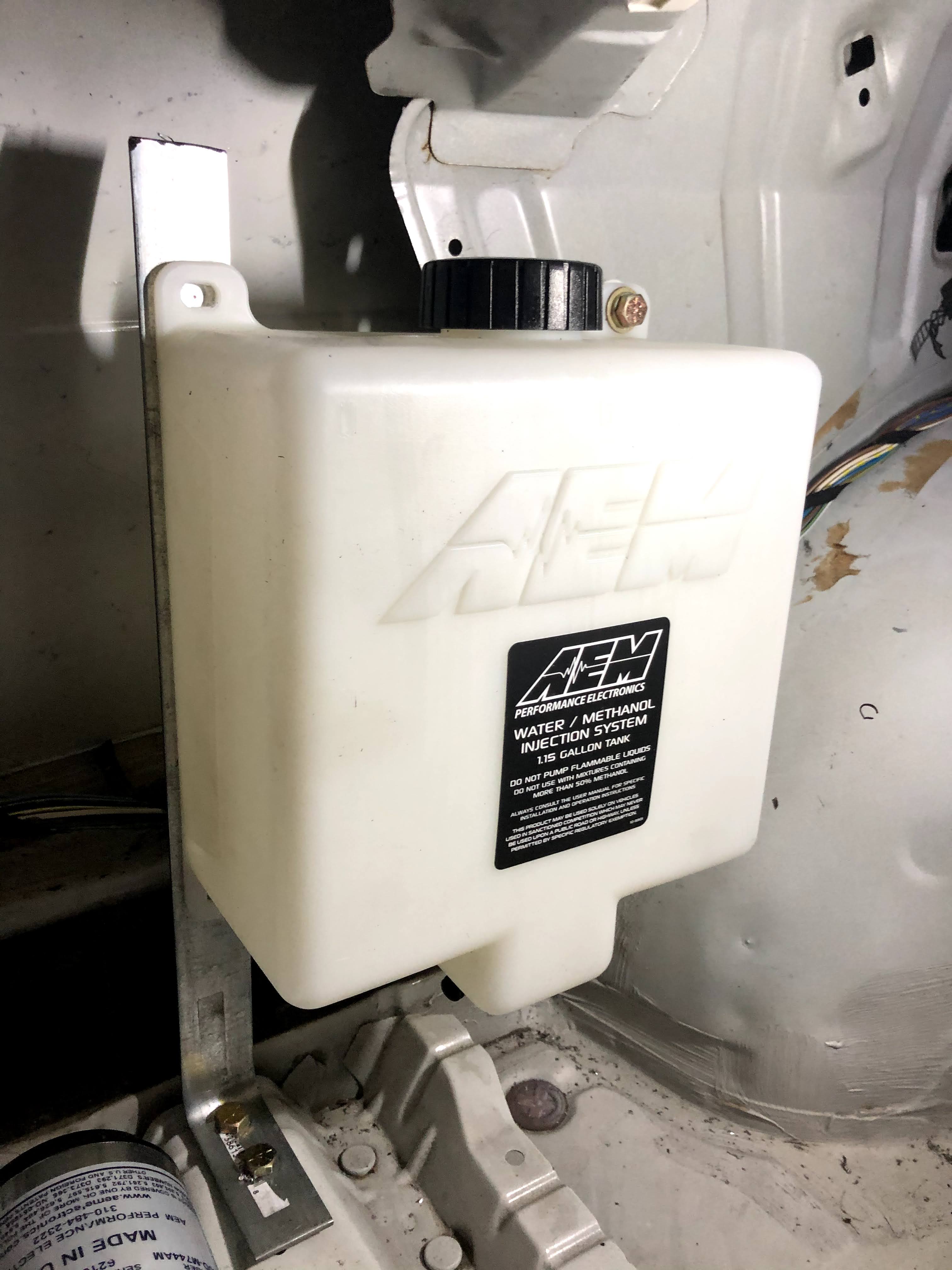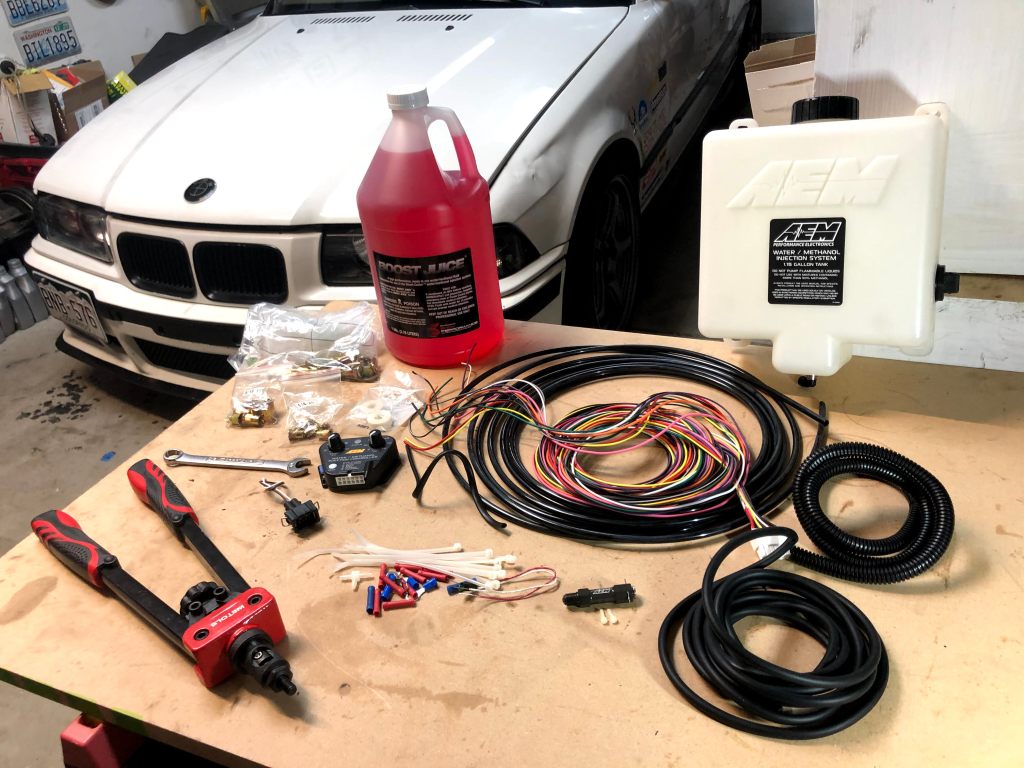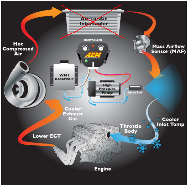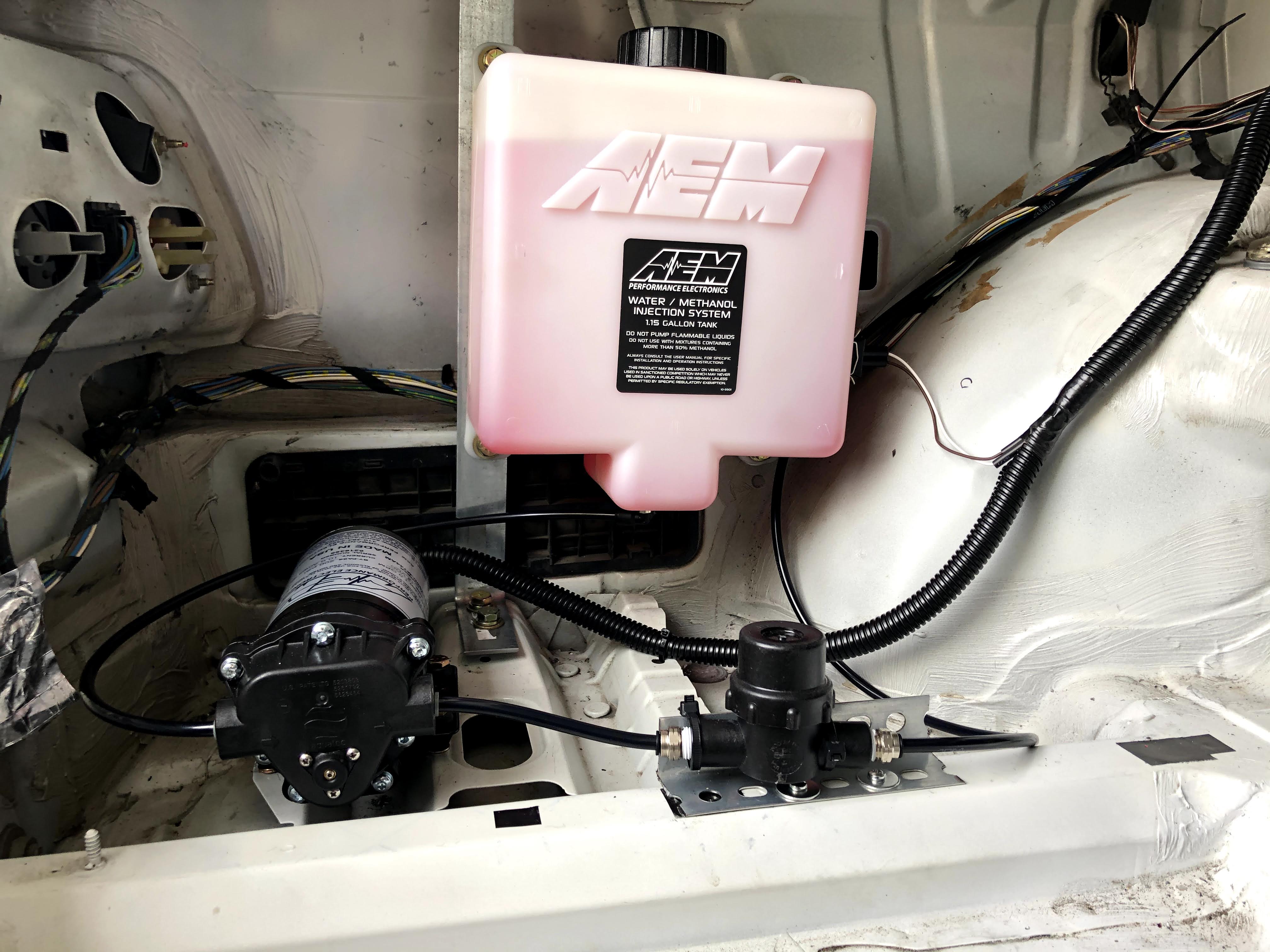 The second most popular method of cooling an engine’s charge air is chemical intercooling. And the most popular type of chemical intercooling is Water Methanol Injection (WMI). With WMI, you’re injecting a highly atomized mist of a solution of water and methanol (usually a 50:50 ratio), via a nozzle placed in the charge pipe, that absorbs heat (water) and increases octane rating (methanol). The combination can reduce the charge air temperature by 100*F. The picture above, from AEM, demonstrates the main parts of a WMI system (I won’t be using the air-to-air intercooler that they have depicted).