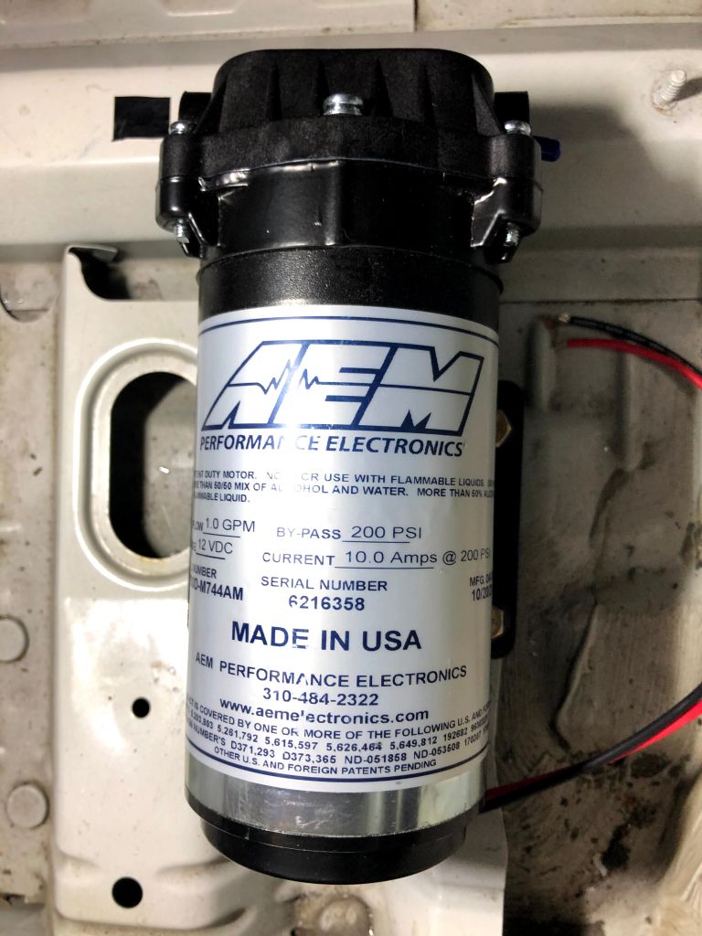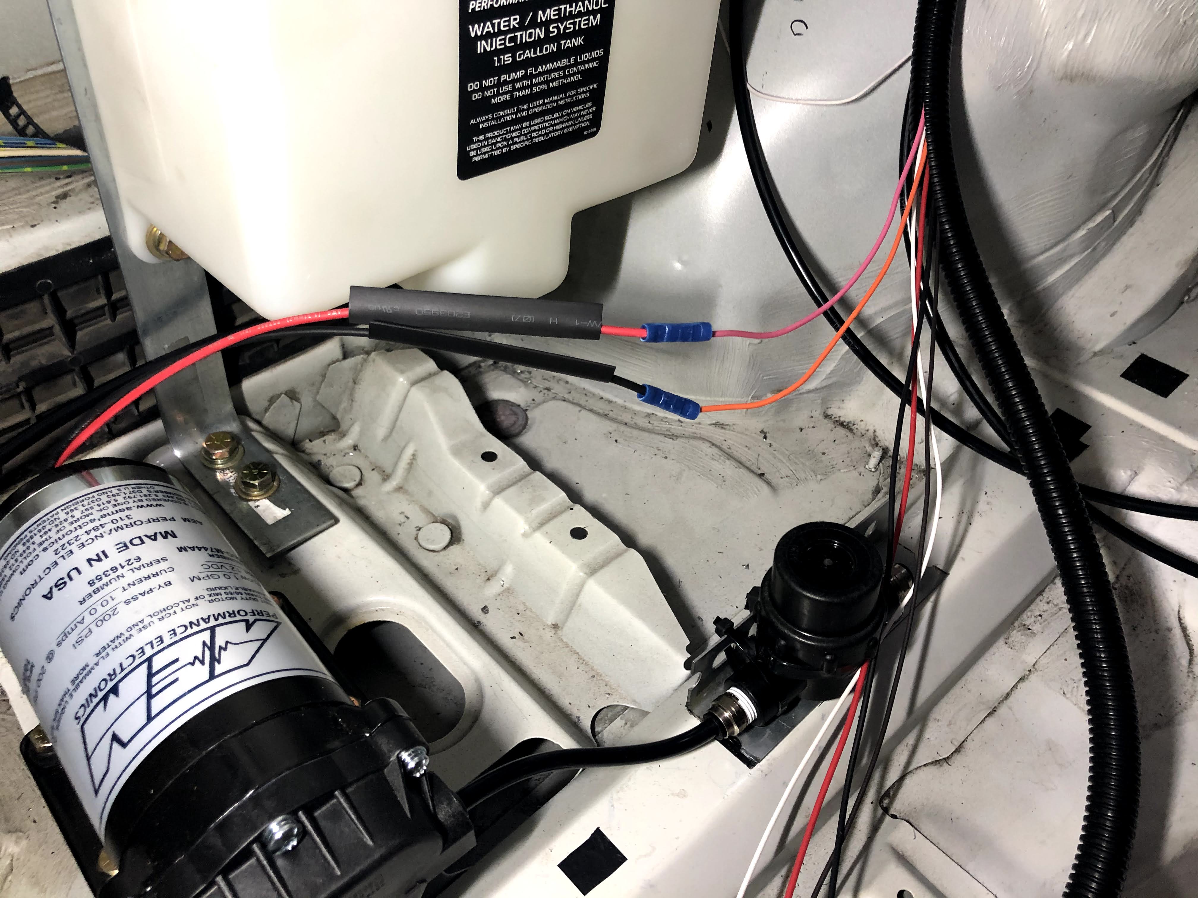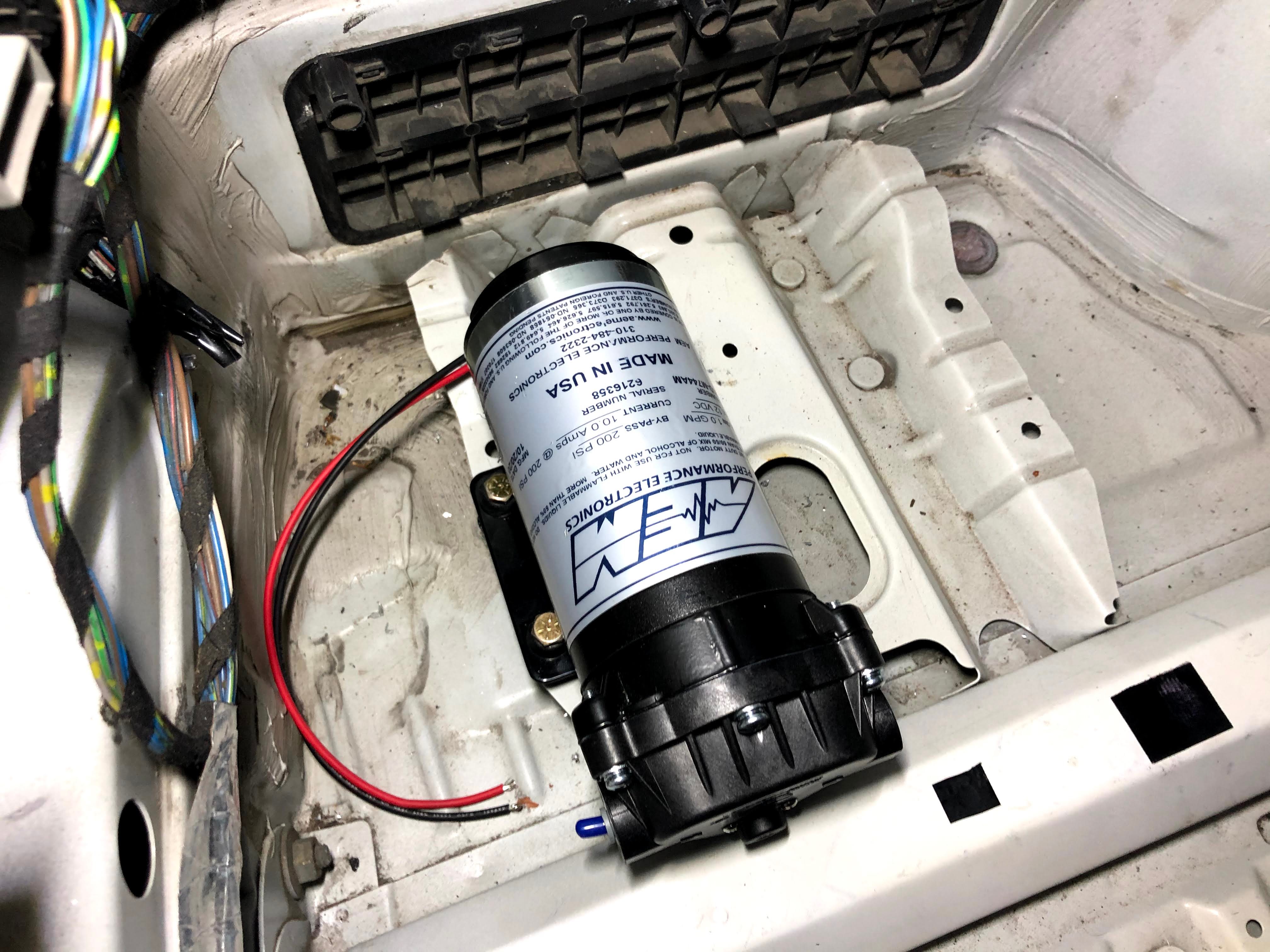 I found a great location for the AEM filter on the frame rail, created a small “L” bracket, and attached the bracket to the car with a couple sheetmetal screws. Then I just had to splice a bunch of wires (per the AEM diagram) and run the wires to the front of the car in a flexible plastic split conduit for protection. You’ll also need to run the actual injection tubing between the tank, pump, filter and to the front of the car as well.