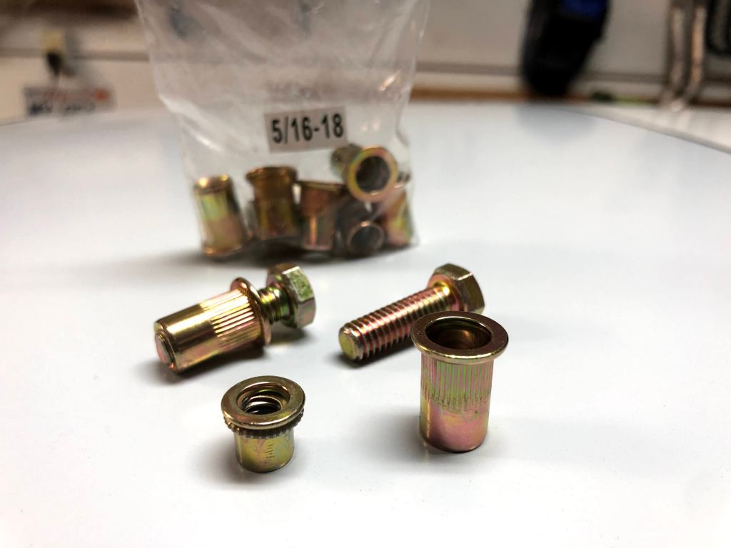 Nut-serts are threaded inserts that can blindly be installed into sheetmetal so that you can secure something with a bolt (and no nut on the back side). The picture above shows the nutsert in it’s uninstalled form (on the right) and what happens to it when you use the nut-sert tool on it (on the left). It basically creates a rear flange that sandwiches the sheetmetal with the front flange. Simple but very effective.