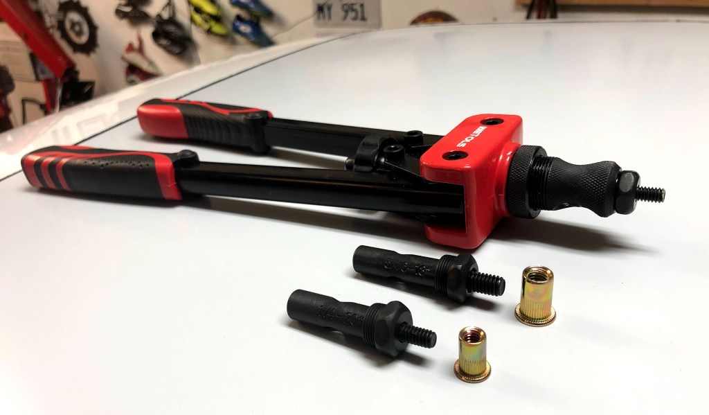 I think it’s very important to solidly mount the pump and tank in the car as they’ll be subjected to a lot of varying loads when racing. Nut-serts looked to be the best mounting method. Take a look at the picture above of the low priced nut-sert (aka rivet nut) tool that I purchased on Amazon.