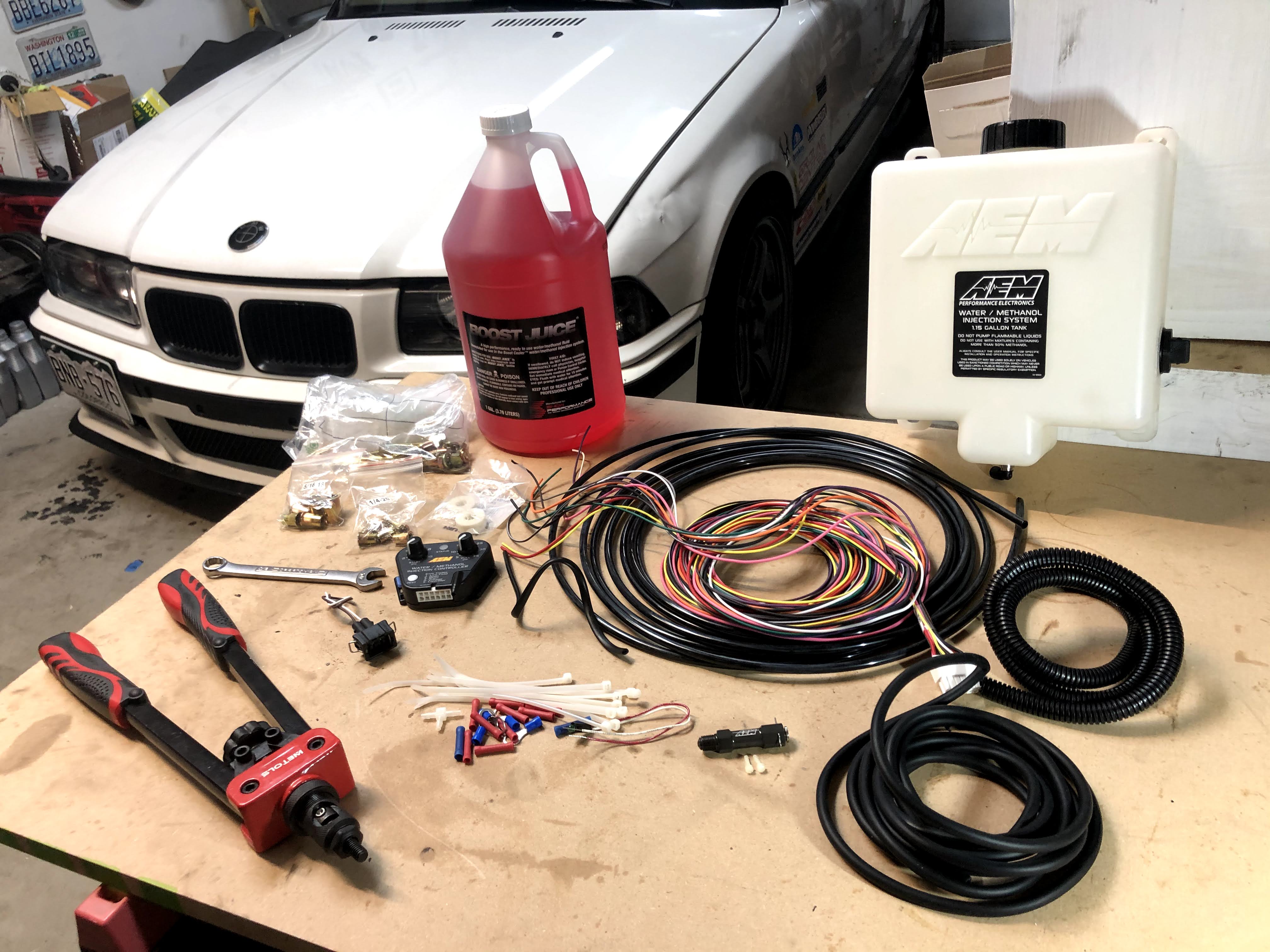 After researching a few different WMI options, I decided to go with the AEM kit (p/n 30-3300, V3 version) as it was an impressively complete system, with an outstanding injection nozzle, and very simple controller setup. The picture above is what I received in the kit (but without the pump pictured as I had already installed it prior to this picture). I highly recommend taking a look at the official AEM video overview of the kit and their interesting test setup that shows the V3 nozzle improvements: