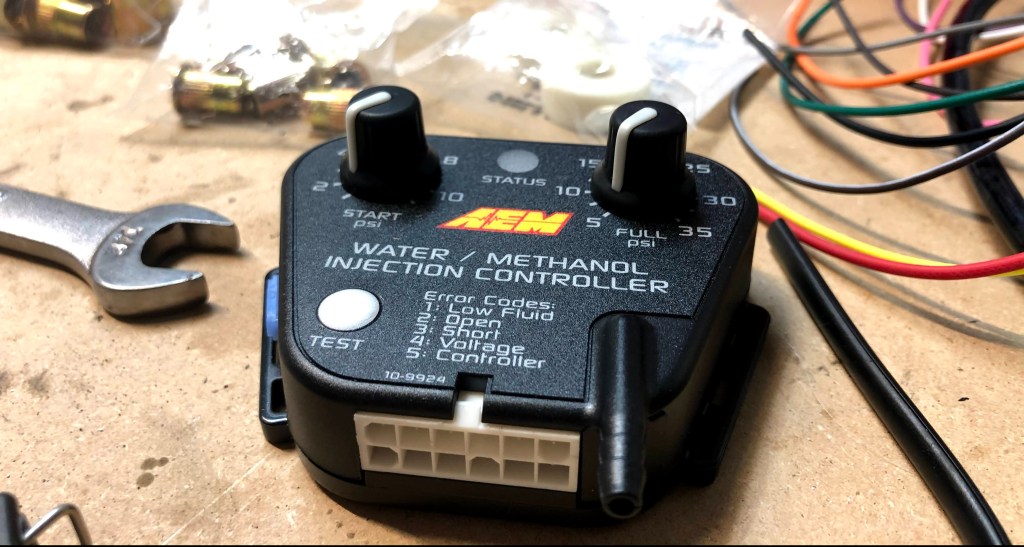 Controller with boost reference nozzle. You can see the two dials that set at what boost level you want the WMI to start and when you want it to be at full flow. The flow increases linearly between the “start” and “full” settings.