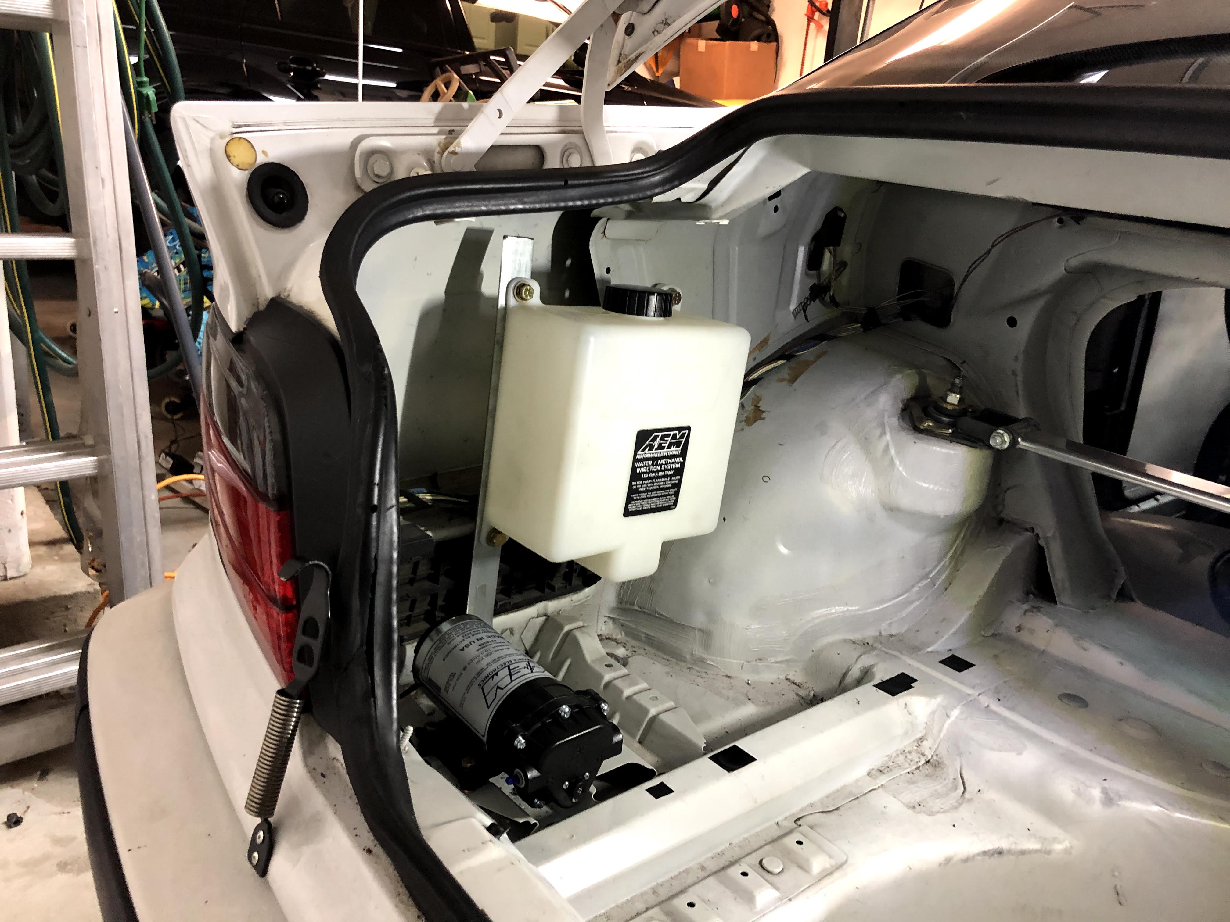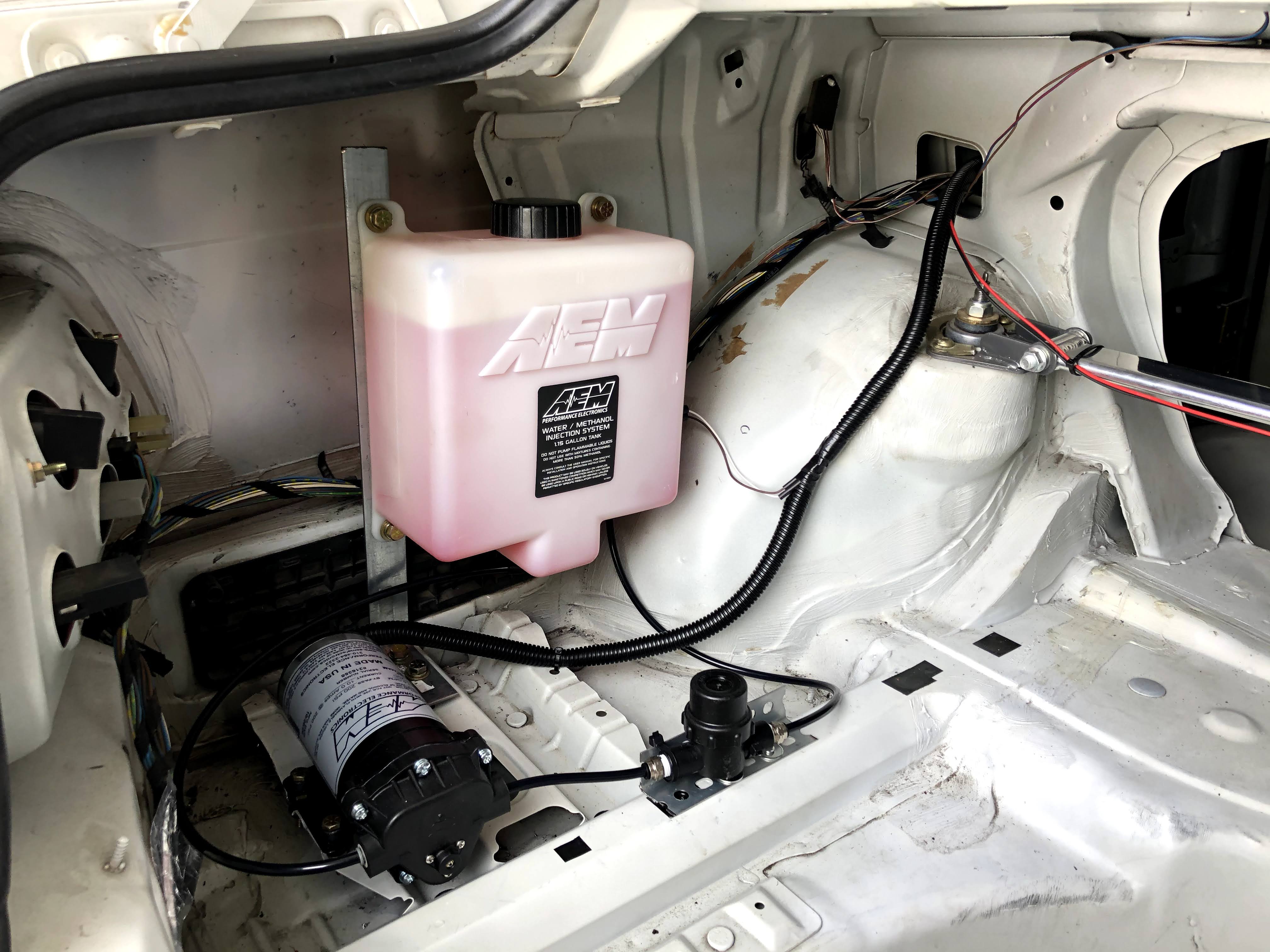 The first step when installing the AEM kit is to determine where to mount the tank and pump. Luckily, with a stripped interior, I just had to go searching in the back of the car for some suitable locations. I discussed possible locations with a fellow BMW E36 enthusiast, Phillip S., as he had just recently installed the same kit. His setup looked great and so I used it for inspiration for my own setup.