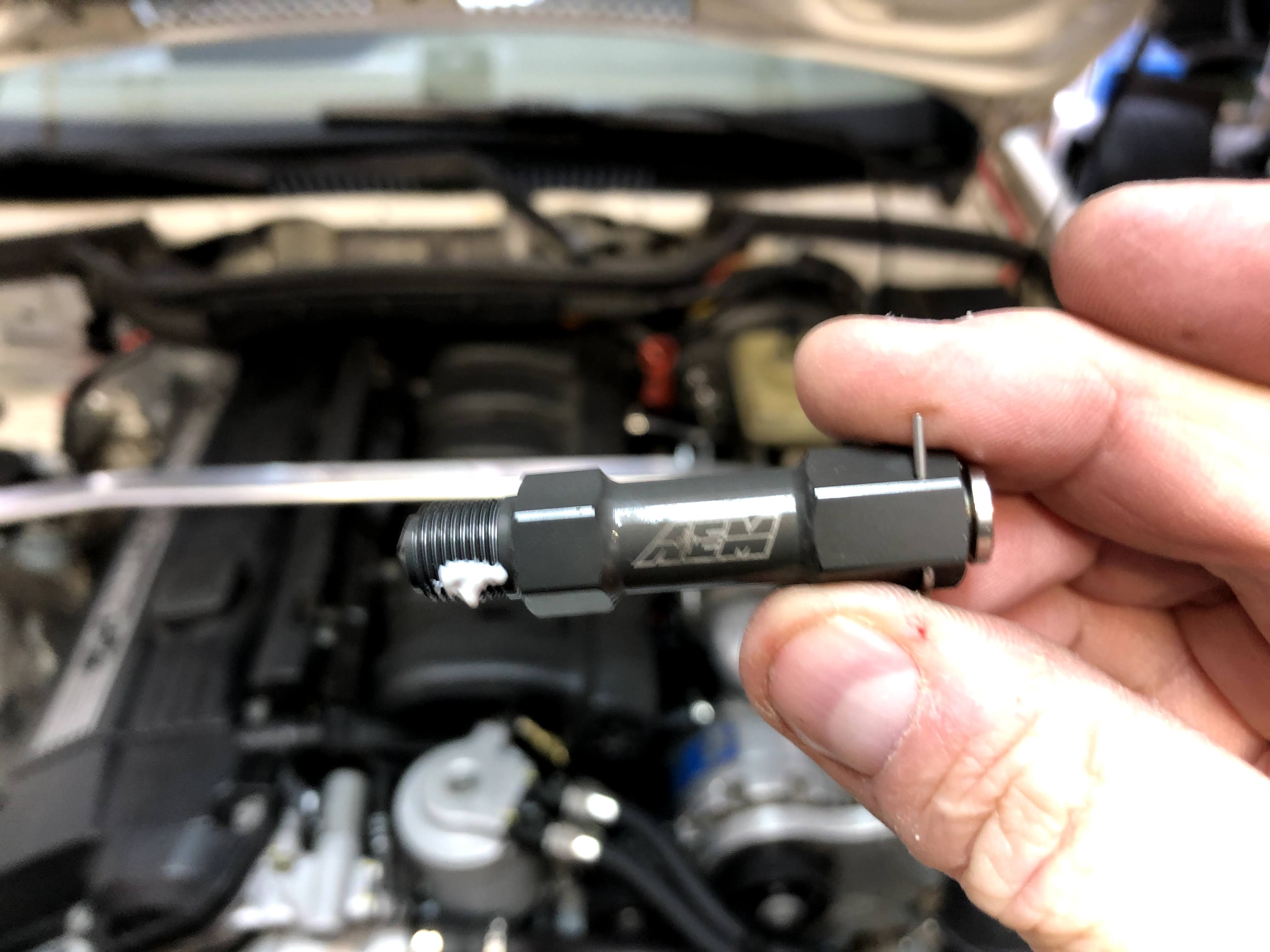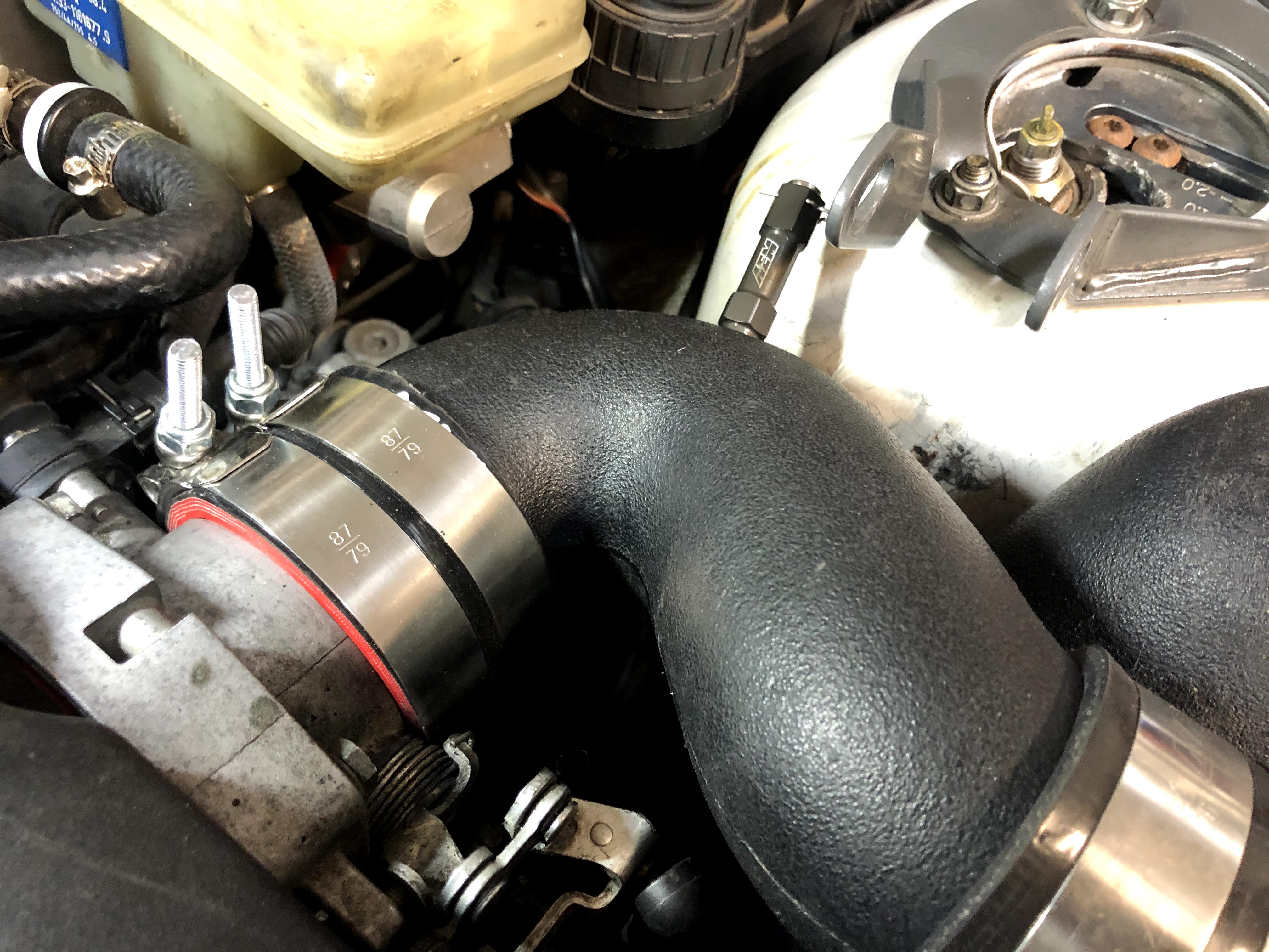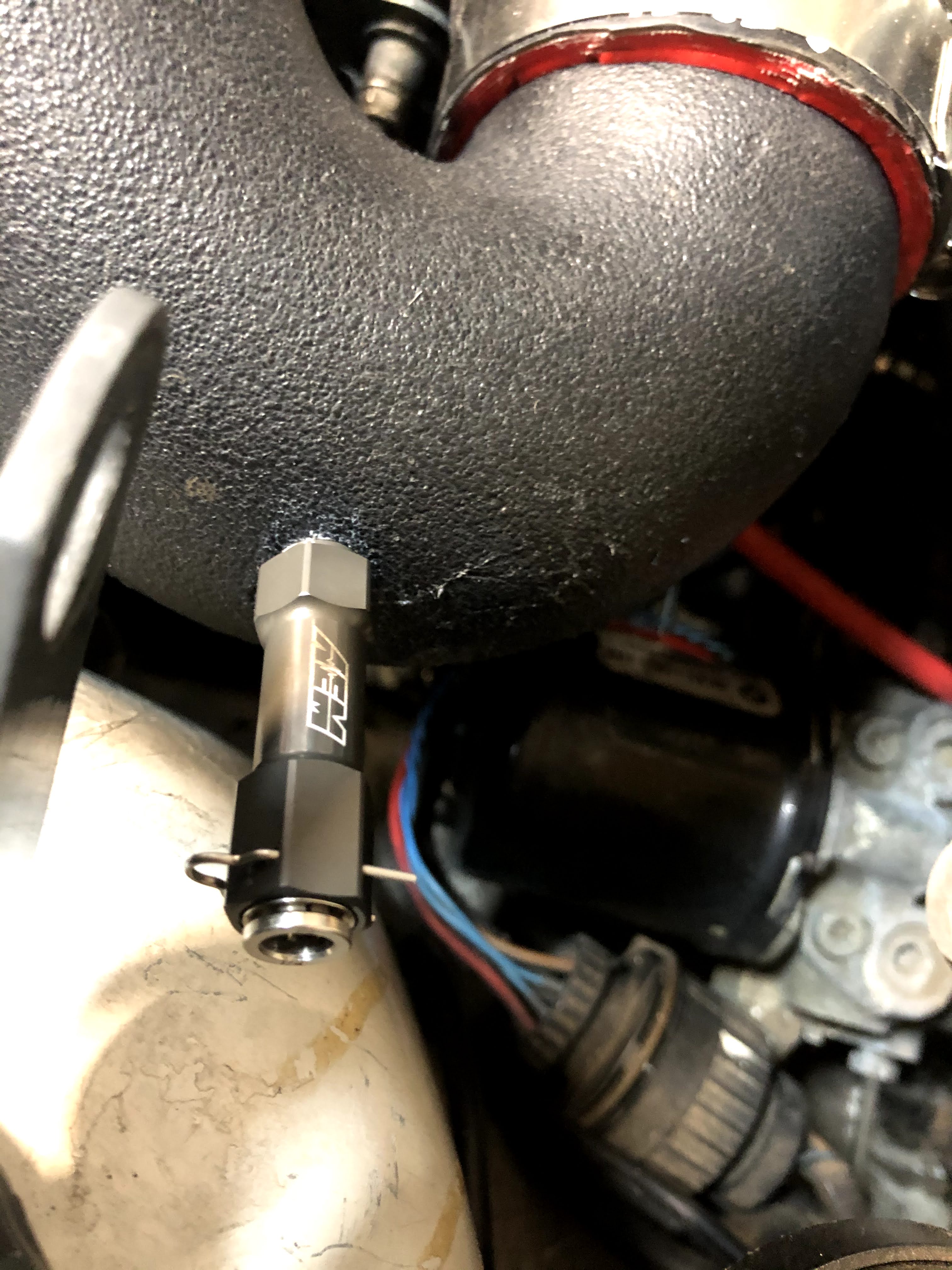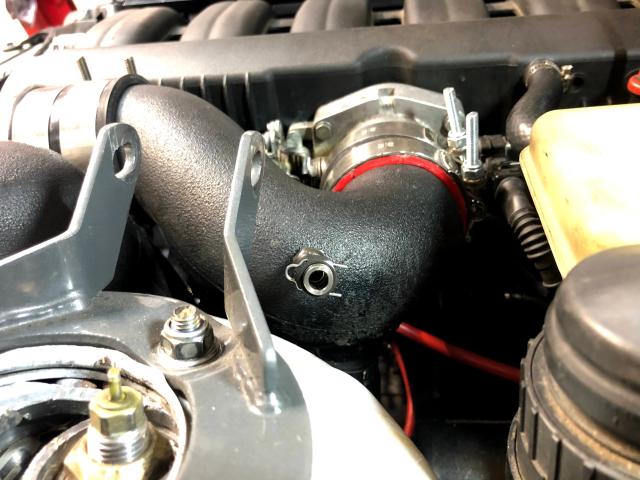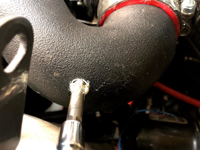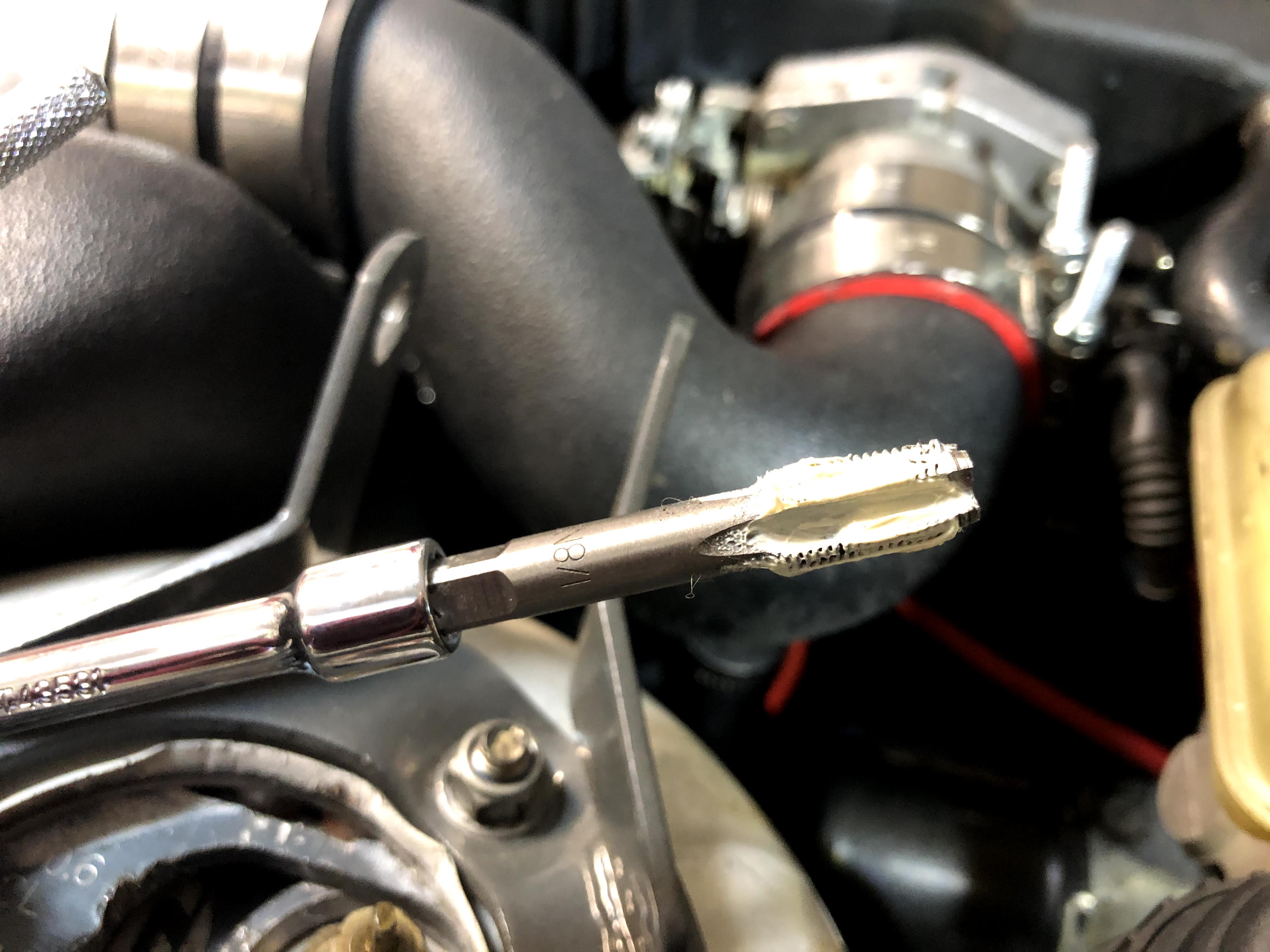I drilled a hole in the plastic pipe and then used a 1/8 NPT tap, coated in white grease, to tap the hole. The grease attracts/traps all the plastic particles so that none make it into the charge pipe. Alternatively, I could’ve just completely removed the charge pipe and tapped it while sitting on a bench, but that’s a hassle and it’s tough sometimes making sure all the screw clamps are positioned correctly and tightened perfectly on the silicone couplers.