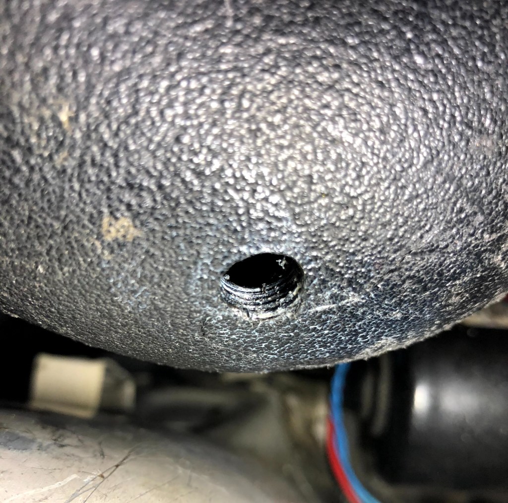 With the bolts installed on the right side of the tank, I could then mark the location for the nut-serts on the steel “L” bracket on the left side.