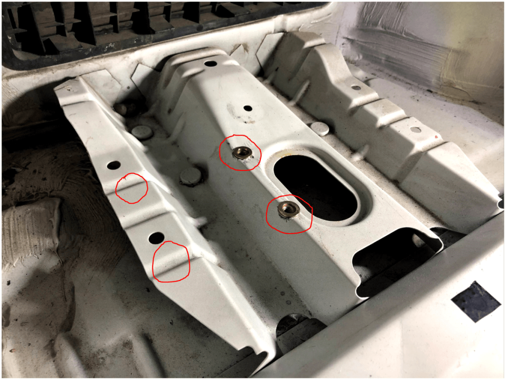 I decided that I could utilize the same floor bracket for some of the mounting and so I used a 12 gauge piece of galvanized steel, bent in a “L”, where two of the mounts would be located. I’ve circled all the areas where I in ended up installing nut-serts (5/16″ size).