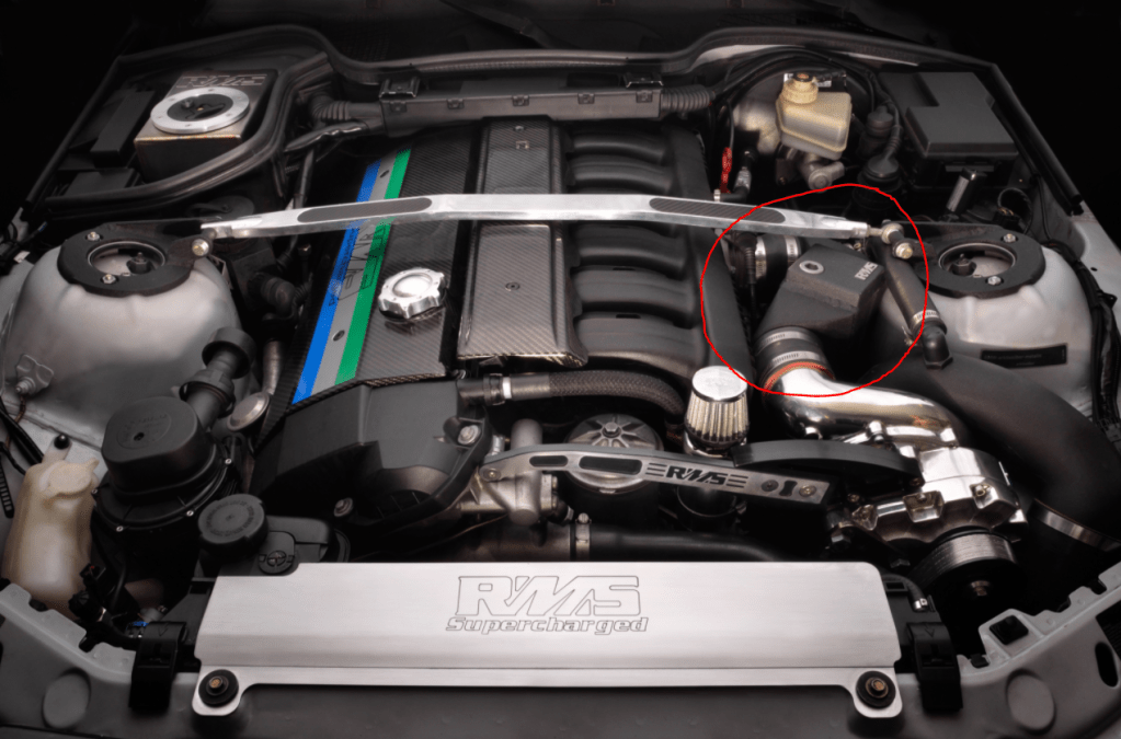 The most commonly used way to reduce the temperature of the charged air is by using an intercooler (either air-to-air or air-to-water). However, due to very tight spaces on the intake side of the S52 engine (also applies to the M50 / S50 / M52), it’s quite difficult to fit the necessary piping for an intercooler. Race Marque Systems (RMS) is the only company that I know of that has managed to cram in an air-to-water intercooler between the supercharger outlet and the throttle body. In the picture above, you can see where the intercooler resides. What you can’t see are the coolant lines running from it to a small dedicated radiator in the front of the car. This is a similar intercooler/aftercooler setup to what BMW uses with their S55 engine (though that charge air cooler is much larger).