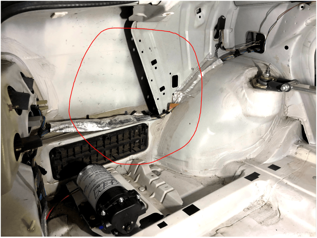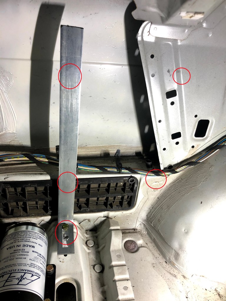 I chose the pictured area of the rear left trunk area to mount the tank. You can see that I have two nut-serts already installed. I installed two more nutserts in the other red circled areas. Just use the pump mounting points as a template.